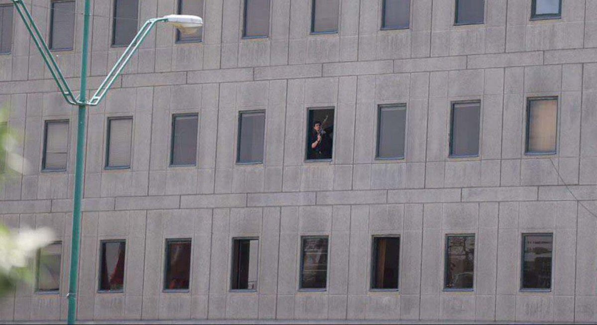 یکی از تروریستها در حالی که مشغول تیراندازی بی هدف بود، موفق شد از ساختمان مجلس خارج شود؛ او همچنان مشغول تیراندازی در خیابان است.